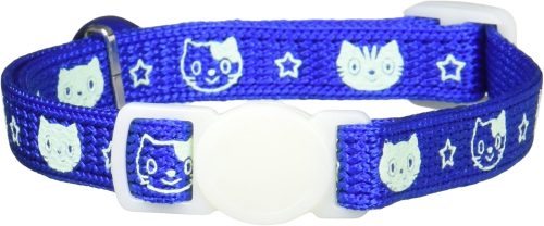 暗闇でやさしく光を放つ、蓄光タイプの猫用首輪。プラスチックパーツだけでなく、首輪の柄も光るのが特徴です。素材にはナイロンを使用しており、体重約7kgまでの成猫に対応します。
