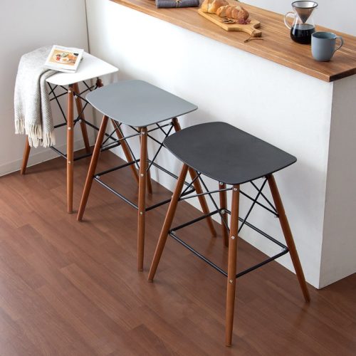 通常の椅子より脚が長く、足を置くためのフットレストが付いているのが一般的。背もたれが低いか、もしくはないタイプがよく見られ、コンパクトで場所を取らないのも魅力です。