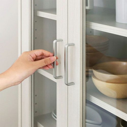 取っ手は掴みやすくてシンプルな形状です。片手でスムーズに開けたり閉めたりできます。また、家具と壁を固定するための免震補助バンドが付属。地震が発生しても食器が倒れにくく、安全性に配慮しながら使い続けられます。