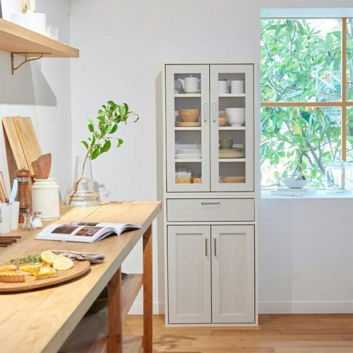 ガラス扉は、外から内部を見やすいのが利点です。食器や食品のストックを並べて置いたときに美しく見せられます。収納棚は高さ調節が可能です。収納する食器やキッチン家電、食品の大きさに合わせて高さを変えられます。