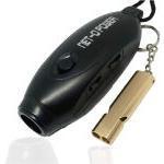 電子ホイッスルと金属ホイッスルがセットになったアイテムです。電子ホイッスルは、最大で飛行機のエンジン近くの音に相当する120dBの音を発します。音量は3段階から調節でき、音色も3種類から選べます。音に変化を付けながら長時間使えるのが魅力。