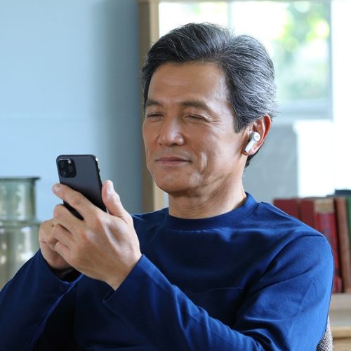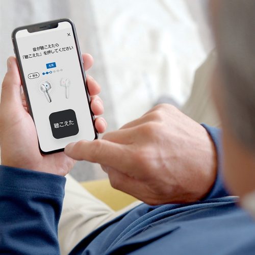 自分にあった聴こえ方に調整できるスタイリッシュな集音器。専用アプリで聴こえの状態を手軽に測定できます。マスク越しの会話を聴き取りやすくする機能を搭載しているのも特徴です。