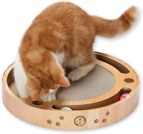 爪とぎとボール遊びが1つで行える、猫の好奇心を刺激するおもちゃ。縁には軽いボールと鈴入りボールの2種類があり、猫の狩猟本能をかき立てます。中央のパッドで、のびのびと爪とぎができるのも魅力です。