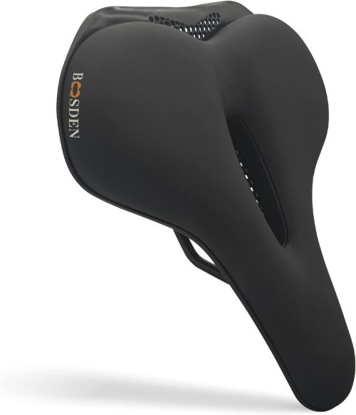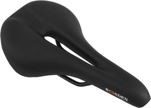 お尻の痛みが気になる方におすすめの穴あきタイプのサドル。中央部に配置された開口部により、会陰部への圧迫感を軽減し、快適なライドを実現します。ふっくらとした低反発クッションが路面からの衝撃を吸収します。