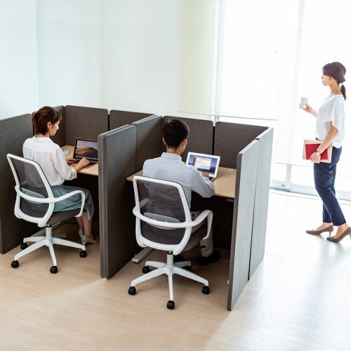 部屋の中に簡単に間仕切りを設置できる、パーテーションタイプの製品。スタンドがなく自立する仕様です。本体の角度を調節して、自由なレイアウトが可能。オープンスペースの中にパーソナルスペースをつくることもできます。