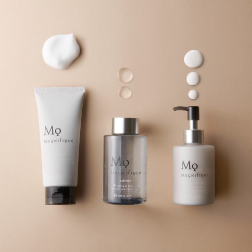 洗顔料は、スクラブ入りのジェリータイプを採用。毛穴の汚れや古い角質をすっきりと落とし、ゴワついた肌をなめらかに整えます。また、化粧水はみずみずしい使用感で角質層まで浸透しやすく、乳液はジェルミルクテクスチャーで溶け込むように軽いのが特徴です。